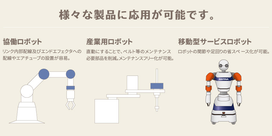 大きな中空構造(中空径φ25.4)を活用しケーブル配線やエアチューブを通すことが可能。ロボット開発の設計自由度向上に貢献